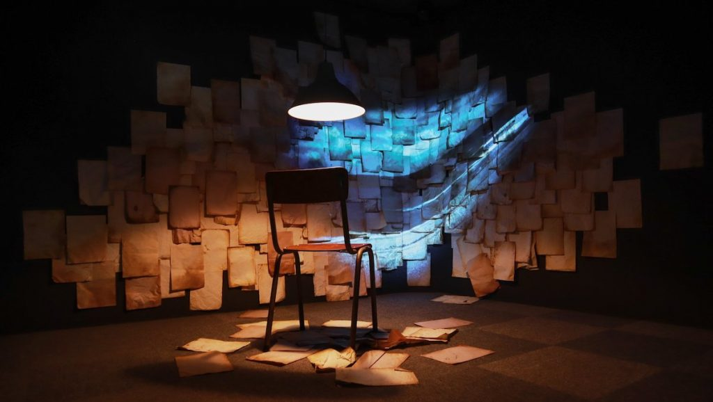 有趣的是,陳芯宜提到的,其實是同樣源自遠古的說故事衝動:「我們總會被故事吸引。假設將VR當成新的科技,而不是從『說故事』這個古老的脈絡去思考,就會被科技綁住;假使,我就是要講一個有情感的故事,讓你有感覺,就可能利用這個科技,做到一些其他媒材可能無法達到的事情。」[4]換句話說,所謂身處現場的身體感,是必須費盡心思去營造的。以此作品為例,包括題材的選取(探討死亡與遺忘)、觀影空間的裝置擺設,都是在科技媒介之外幫助我們進入「現場」的途徑。