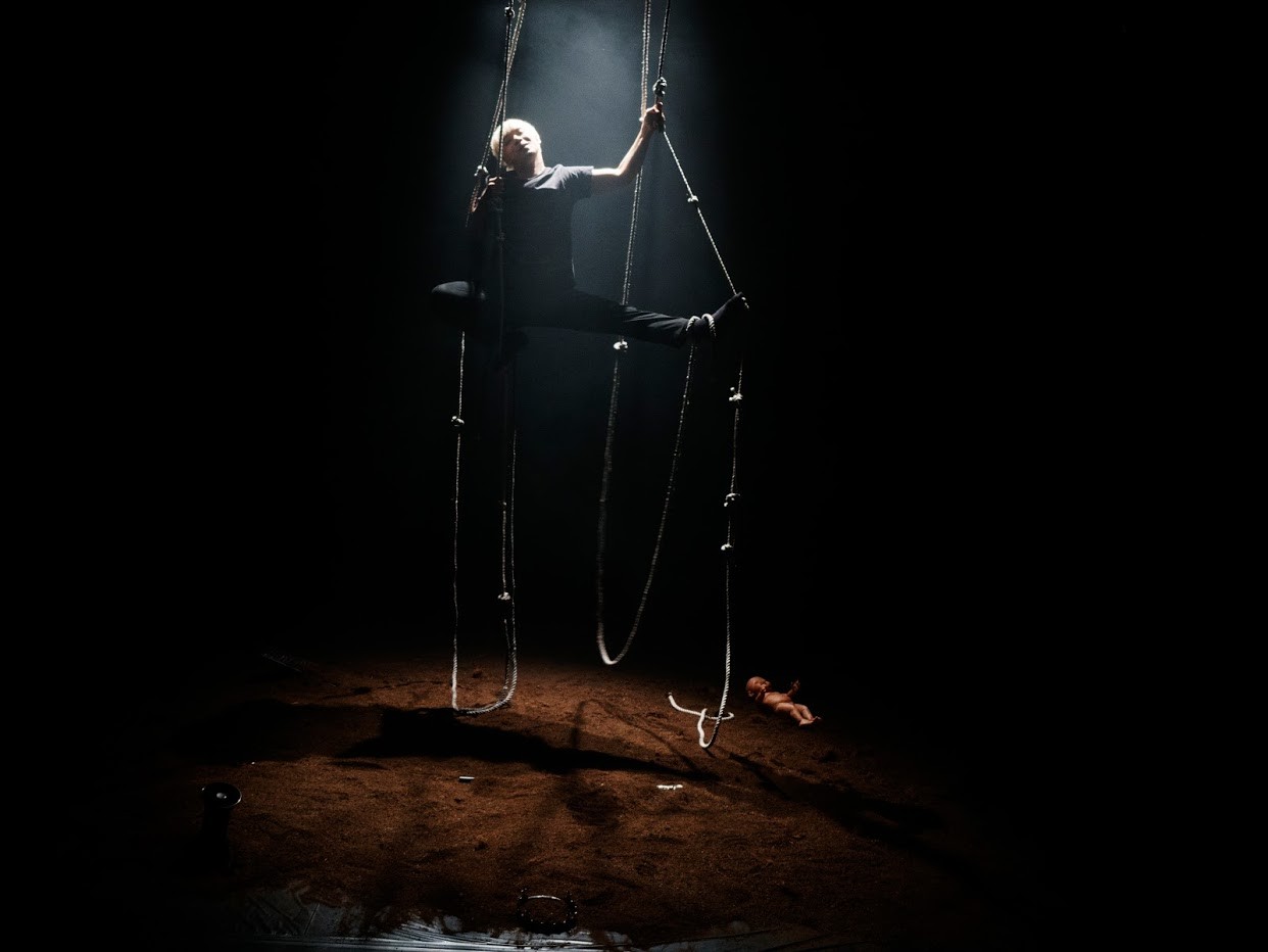 在開場的一片昏暗裡,觀眾依稀辨識出一具被繩索吊掛在半空中的軀體,楊奇殷像被勒住脖子一樣說著:「熱!熱!/是我們誤會了世界會好轉的可能/昨天,一定比明天更好/我窒息,但不是被警察壓倒在地上/這個地球爛爆了!爛爆了!」然而,與其說他是懸浮,他的身體更接近不斷地下墜,以至於當他墜落在沙地上時,雙手仍然像一隻地鼠般往下挖,似乎他要把自己埋進地底下,因為關於那場運動的記憶——佔領議場、與警察爆發流血衝突、慷慨激昂的學生領袖吶喊口號——已經全部化為塵土:「漂亮的說詞!美好的夢想!突變的迷因!/所有的理智現在全都變成了走音的歌聲」,他對著從指縫間流光的沙粒說。