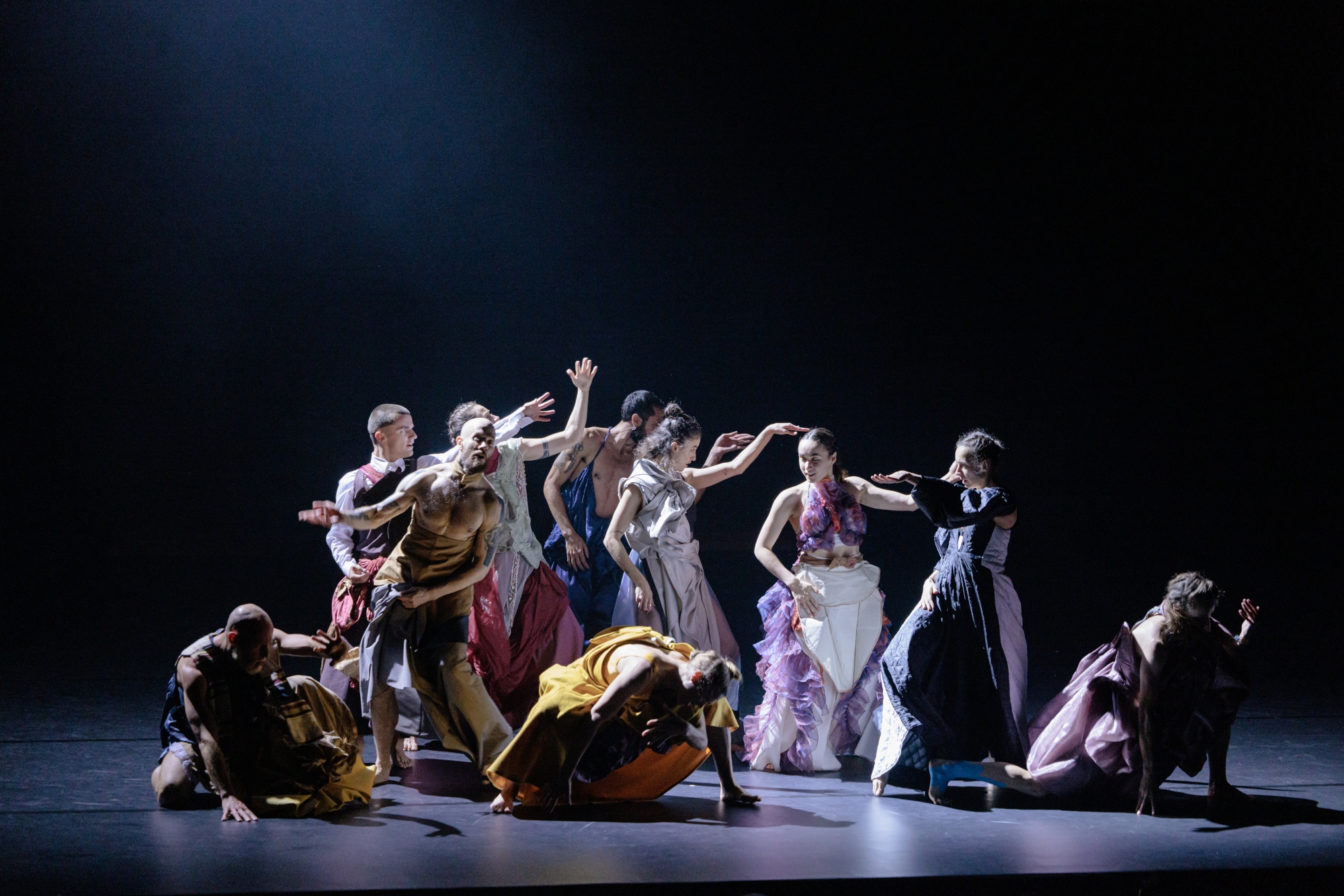 很多時演藝廳這段大舞台演出,觀眾也是明確地被「第四面牆」隔開以觀看舞台的所有呈現,而這次演出另一個有趣的地方,就是編舞刻意安排多個段落於舞台最前端發生,讓舞者們打破那道無形的牆,直視著台下觀眾表演。我在觀看演出之前一直對他們熱切的眼神感到不解——將那個段落,那段舞蹈所呈現的氛圍(有沉重的,也有輕快歡愉的)拋到觀眾席,是否有甚麼必須要表達的意思?個人感覺,舞者們的眼神除了吸引觀眾將所有注意力盯在自己身上(而這本來單靠他們流麗的動力都已經做到),還帶著交流、邀請的意味,那到底要邀請我們到哪裡呢?當前演出的環境,觀眾只能被動地,安座於席上凝望台上舞者們於舞台上帶著舊時候鄉愁的狂歡,但他們有沒有更投入更中,以獲得更多力量的可能性?