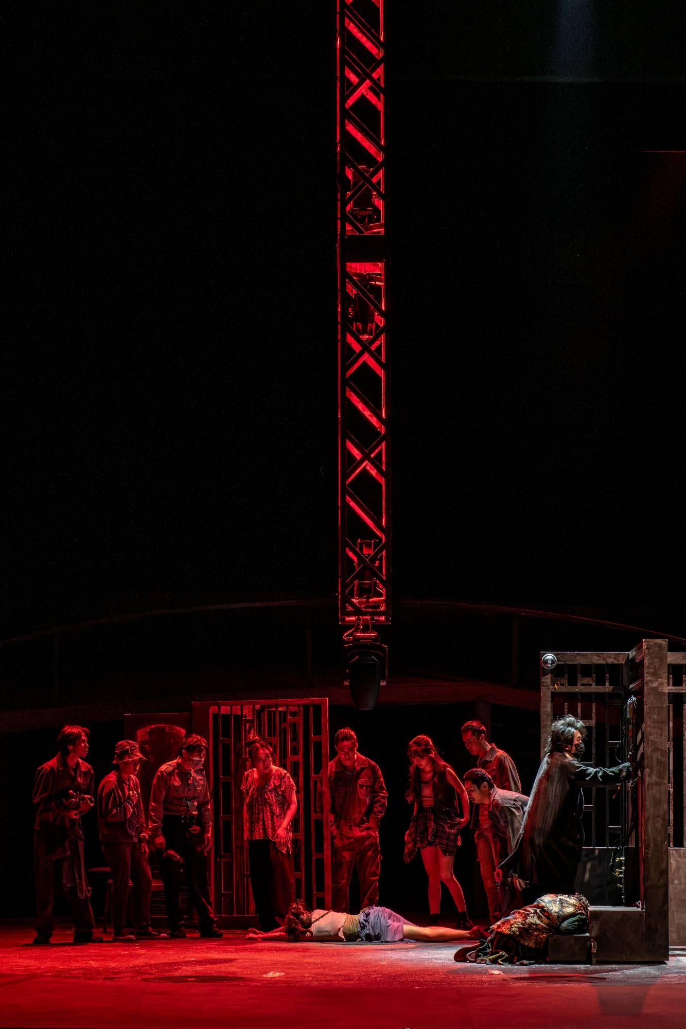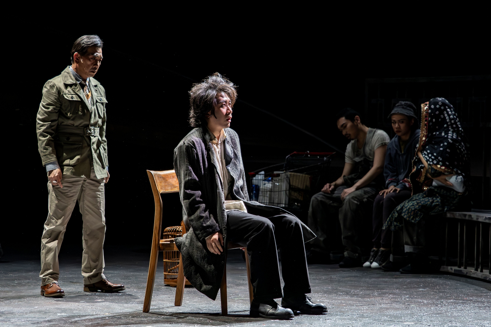這種矛盾的心理狀態,被放大至舞台。上半場的旋轉舞台,安放了中式的鏤空窗格而模擬的當舖、單人床與斗櫃的房間、長椅街角、扶欄,場景簡約卻寫實,換景流麗。除明快地交代情節外,也能呼應角色的內在焦躁。空間的旋轉移動,燈光的忽明忽暗,密集且突如其來的全黑場景,從意識狀態出發令敘事的空間與順序斷裂而跳躍,具象化了主角的精神世界。從視覺效果來看,舞台佈景成為了主角心境的具體呈現。台上的人物服飾以及佈景設計,都以灰沉色調為主,鏤空鐵柱隨殺人情節降下,金屬的材質冰冷剛硬散發紅光,對比強烈,觀眾隨著群眾演員的圍觀注視壓迫的舞台空間。從左右拾級而上的橋橫亙在舞台上方,黎政歧在收到母親(區嘉雯 飾)的來信時,母親站在橋正中央,舞台燈光未有照亮演員的身影,母親的關心愛意如黑影籠罩,親人的犧牲付出令人壓抑,只是除了這一幕,此部分的佈景未見其他明顯的用途。最尾一幕,鏤空鐵柱緩降,與下半場的橫樑佈景組成鐵十架的模樣,舞台上方四下散射的白燈光束,朦朧而充滿儀式感,畫面富宗教的意味,也是主角在承認過犯後,內心得到救贖的象徵。