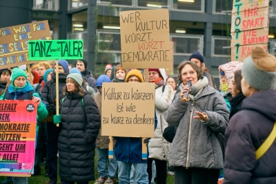 In January, the scene’s strong network was already evident, as on 16 January more than 200 artists stood in front of the state parliament in the freezing winter cold with banners and posters. This was the first demonstration against the cuts.