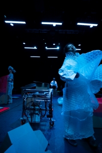 到了晚上,空間定位改變為盛載表演的場域。除了物件擺放位置有所不同之外,在陳的構想中:「Nadim的作品是一個地景(landscape),讓身體回應的脈絡(context)。」如人在家中按意願擺放物件,身體動線卻從此被界定,人、物互相定義生活的進行方式。陳把場域想像為一間包裝工場,在一個小時多的演出中,四位工人(李嘉雯、胡日禧、張兆熹和朱仟青)與物的關係在操控、失控、愛戀及無感中來回轉換,然而看似流動的關係無法脫出當下生存景況的沉悶和無目的,為倦怠壓跨的人們還是跟著一種莫名的大意志的驅使向前跑,像滾輪上的倉鼠。