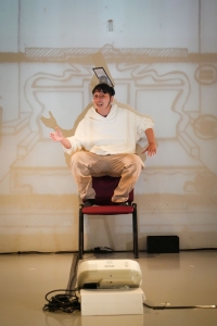 黃朗然在白牆上投映出一幅全家福,隨即開始自述身世,娓娓道來。接着,他在照片上覆蓋透明膠片,並於其上塗寫勾勒。一層膠片疊着一層,添上箭頭、火柴人、圈點標注、再畫個公仔……此般形式牢牢吸引筆者目光——這是甚麼?原來是昔日的教學過程!回憶紛至沓來:從前老師把那台有輪子的機器推來推去,稱之為「高映機」(overhead projector)。眼前這台機器看起來雖是先進型號,卻瞬間喚醒童年的上學記憶。翻查資料,方知大埔藝術中心前身為大埔官立中學,頓時領會導演將場地特性徹底運用,化為此劇獨特的載體。