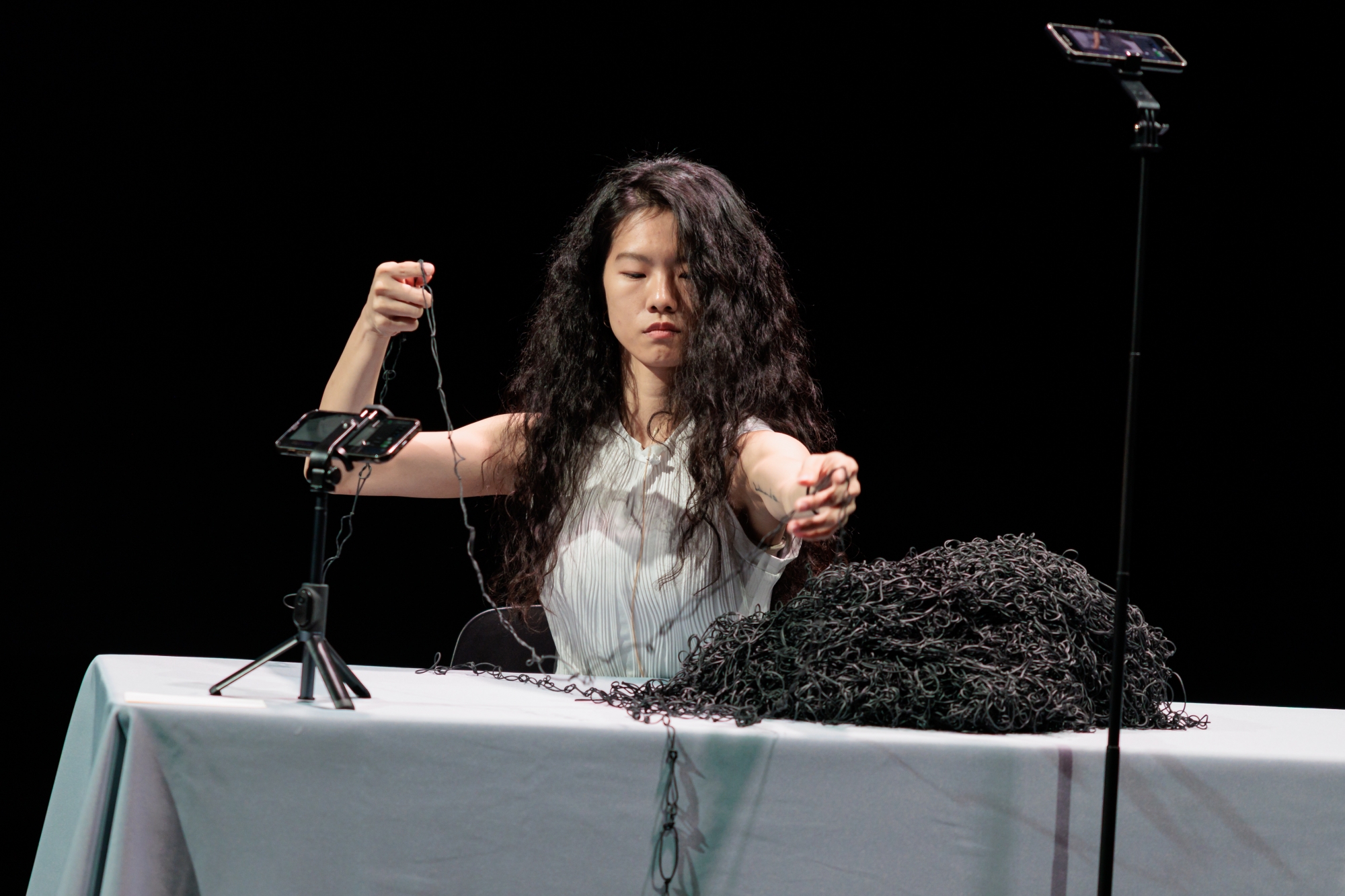 另一位跨媒介的是朱仟青,她本科是視覺藝術,後來再去讀舞蹈,作品從物料開始: 大堆糾結的黑色橡皮筋。看著她一雙手,靈巧有志地解結、安放、再解,已是一場讓人很療癒的行為藝術。然後她從性騷擾事件受害者的角度,以細陳身體第一身體驗身體凍結的精神狀態,以micro choreography為方法,細考Freeze、Fight 及Flight 之間難言的掙扎。