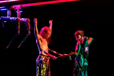 很喜歡峇里島二人組合Gabber Modus Operandi 的音樂,難以歸類,猛烈的踢鼓、尖銳的鋸齒、工廠噪音,沉細怪叫,硬電子基底,同時,散發濃濃印尼傳統音樂的神秘情調,既數碼又古老,燥動又荒蕪,加上懸空的龐然機械裝置,橫開一半演區,像條休息中的巨獸,等待發號司令的騎士,都讓觀眾馬上進入cyberpunk 或復古未來的電影氛圍。但是,我們都只是抽離的旁觀者,欣賞眩目的劇場設計,卻未有打開未來的想像,如人和非人,人和不同機械界面的關係是什麼?機械成為身體的延伸,然後呢?人機合一是新的物種?可穿的機械衣服,把幾個人串合或分離又如何?舞蹈本身反而帶著濃厚的部落儀式感,舞者雖然沒有角色,身份隨時變動,但群舞和獨舞之間,容易聯想為女神和群眾之間的矛盾或愛人之間的恩怨,仍離不開人本中心的視覺。有趣是,最後一男一女舞者放下機械衣服羈絆,自主起舞,上天落地,最好看,能量爆裂。也許,回到未來,自由和權力,永在的矛盾。