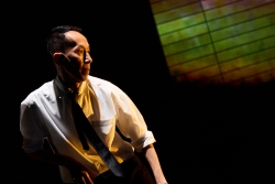 《W.T.F.》這個單人表演包涵了很多不同的面向︰黃大徽的個人經歷、香港的歷史變遷、舞蹈和創作的反思,和對身心衰老的焦慮。只見黃大徽安安靜靜在舞台正中坐在書桌前,換上白衫黑褲,戴上黑框眼鏡,從容淡然的讀著那疊人生履歷——以 60 歲人生里程碑為契機,黃大徽回溯三十年前半途出家,從新聞工作者投身成為舞者和編舞家的心路歷程。我知道台下有不少觀眾是認識黃大徽多年的編舞家和藝評人,這個演出就像聽老朋友說著陳年往事,讓新舊觀眾重新認識黃大徽的過去。