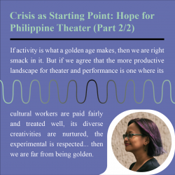 Just as it is easy to tick off a set of boxes so that one might claim to be in a theater renaissance, so it is easy to imagine that the precarity of theater workers has little to do with the plays and performances we are staging in the Philippines. This surfaces a shallow understanding of the role of capital in the making of theater: how it works and dictates the kinds of creativities we can engage in, the kinds of products we offer a public, and even how we define that public.