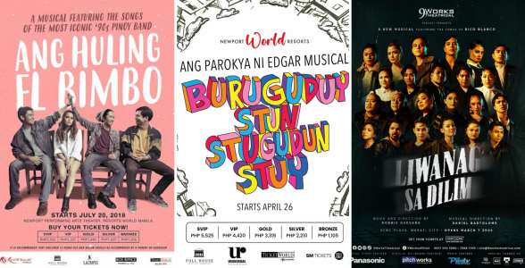 Jukebox musicals as a mode of production that feeds off a niche audience readiness to spend on nostalgia. From left to right: Ang Huling El Bimbo, 2018, 2019, 2023; Buruguduystunstugudunstuy, 2024; Liwanag sa Dilim, 2025.
