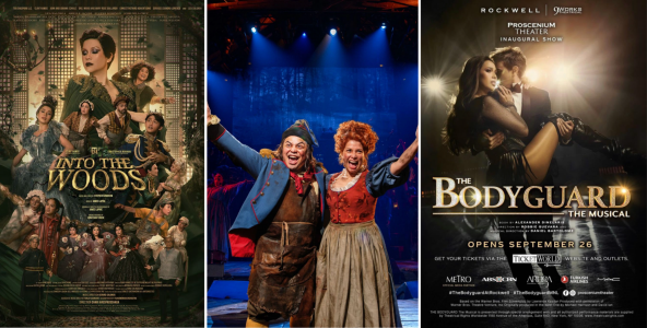 Large scale foreign productions on overdrive, a mode of production that feeds off colonial mentality in the name of sold-out shows. From left to right: Theater Group Asia’s Into the Woods, 2025; Red Concepcion and Lea Salonga, two of four Filipino actors in GMG Productions’ Les Miserables, 2025 (image from GMG’s Facebook Page); Nine Works Theatrical’s The Bodyguard The Musical, 2025.