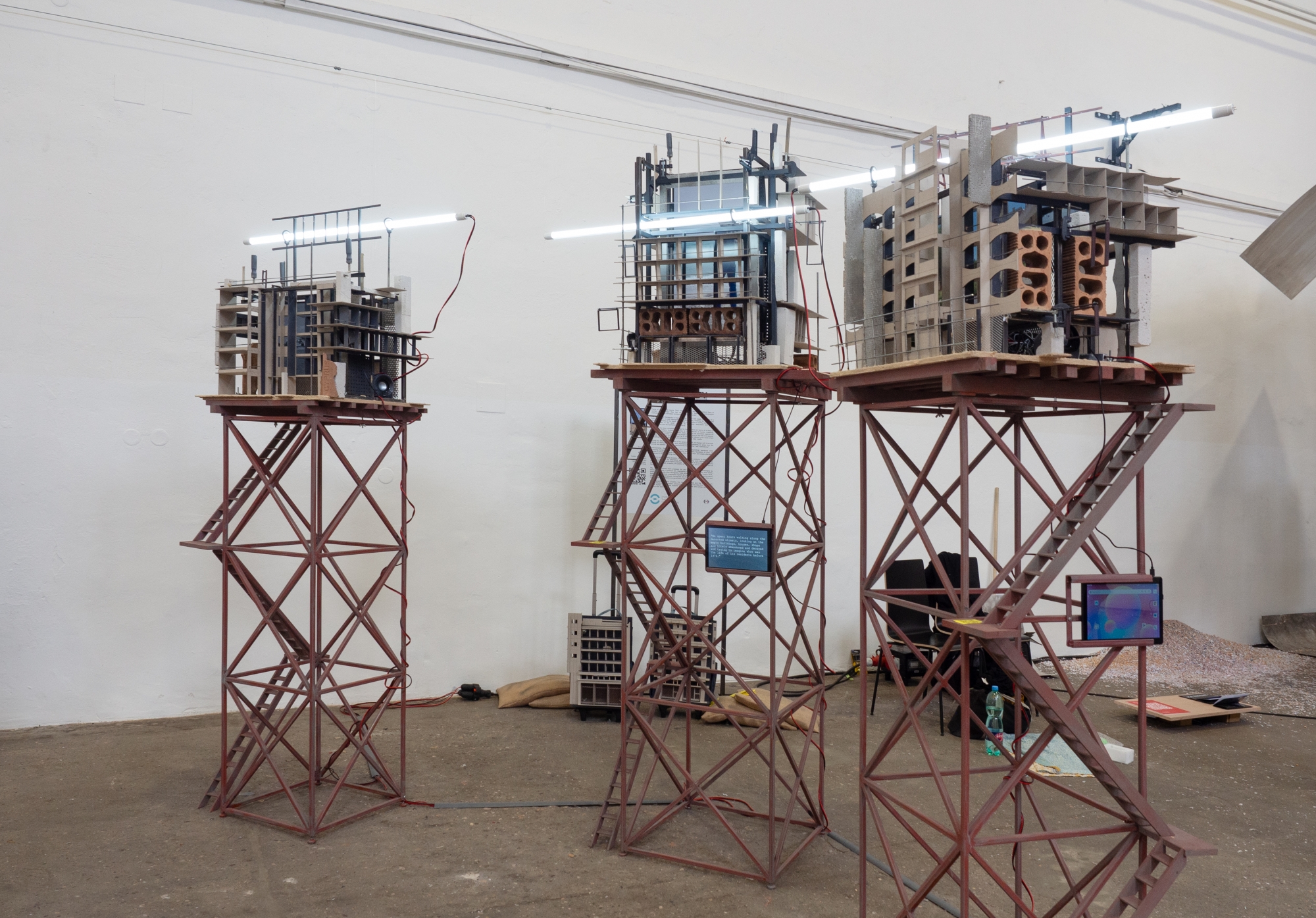 《鬼城裡的觀眾》透過蒐集法馬古斯塔的相關歷史記憶進行研究,並使用在當地找到的材料,打造出三座法馬古斯塔在地建築風格的模型。兩側裝置模型中的熒幕,分別播放法馬古斯塔在1960年到1974年間的歷史畫面,以及現今城市的樣貌,中間則是藝術家背負著建築外觀的行李箱,進行「步行演出」的畫面。觀眾認真凝視完這座禁錮城市的生活風貌,緩緩走向模型側邊時,卻會驚覺自己已被模型內的攝影鏡頭記錄下來,彷彿那些建築模型內也有著鬼魂般的觀眾凝視著自己。