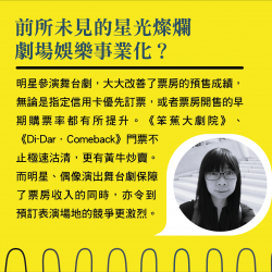 明星參演舞台劇,大大改善了票房的預售成績,無論是指定信用卡優先訂票,或者票房開售的早期購票率都有所提升。《笨蕉大劇院》、《Di-Dar.Comeback》門票不止極速沽清,更有黃牛炒賣。而明星、偶像演出舞台劇保障了票房收入的同時,亦令到預訂表演場地的競爭更激烈。過往使用香港及九龍表演藝術場地的,主要是香港九大藝團、香港藝術發展局資助藝團、康文署各個節目組、西九表演藝術、香港藝術節、外地訪港的音樂會或音樂劇,還有一些小型藝團及獨立表演者。舞台劇娛樂事業化,多了投資者加入,對表演場地的需求亦隨之增加,直接或間接與上述的表演藝術機構和團體競爭場地。