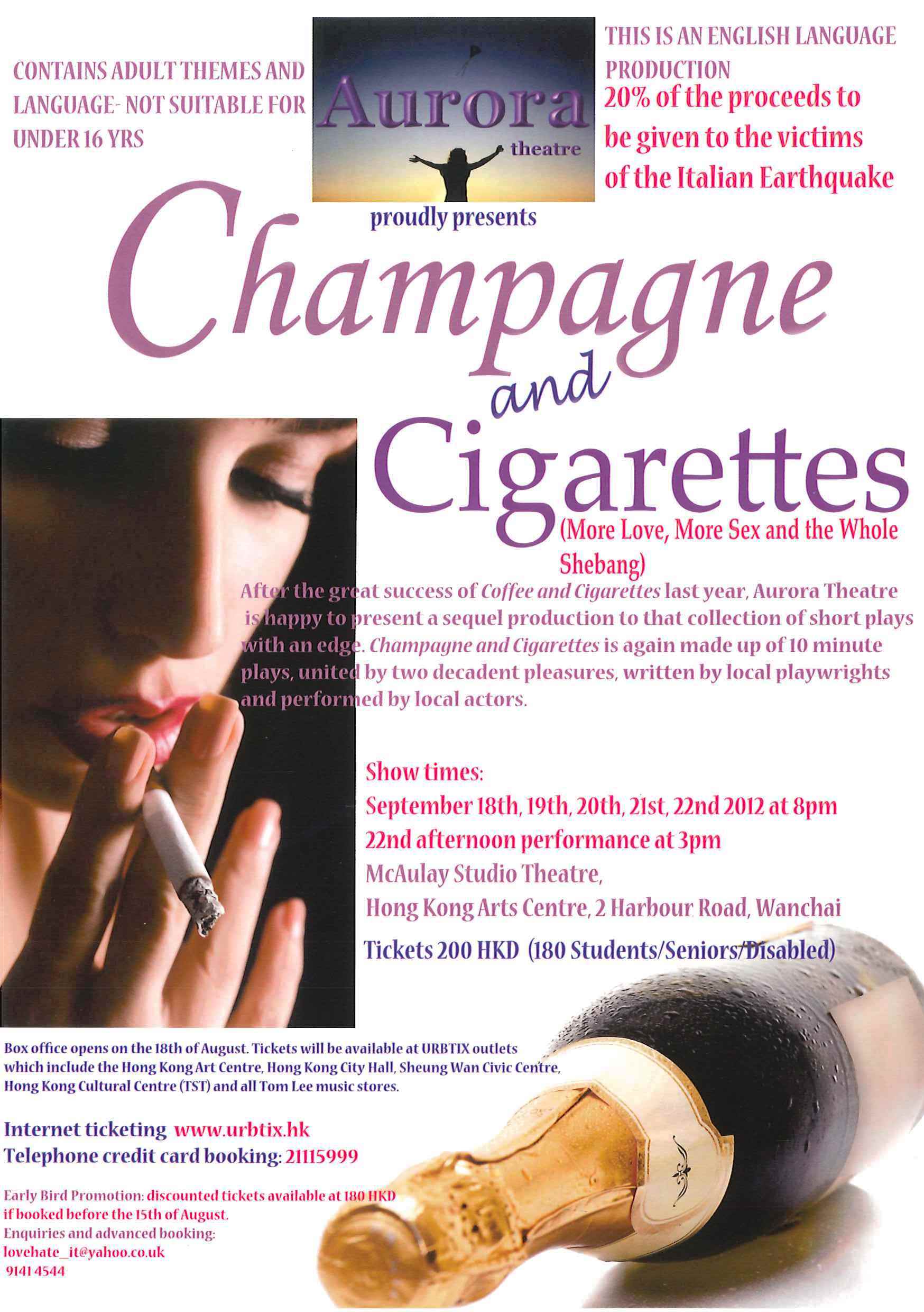 內容簡介 | Champagne and Cigarettes is again made up of of 10 minute plays, united by two decadent pleasures, written by local playwrights and performed by local actors. |