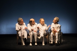 這四個孩子在下一幕,搖身一變成為四位養老院的同伴。其中一人還得尬上護士一角,忙進忙出,不過劇情流暢的程度,真的會讓人相信台上有五位演員而非四名。特別是飾演女角的表演者,倘若不看節目單、或者對弗洛茲劇團不太了解,肯定會認為台上應得有一女演員,否則如何能將女性的動作描摹得如此細膩?