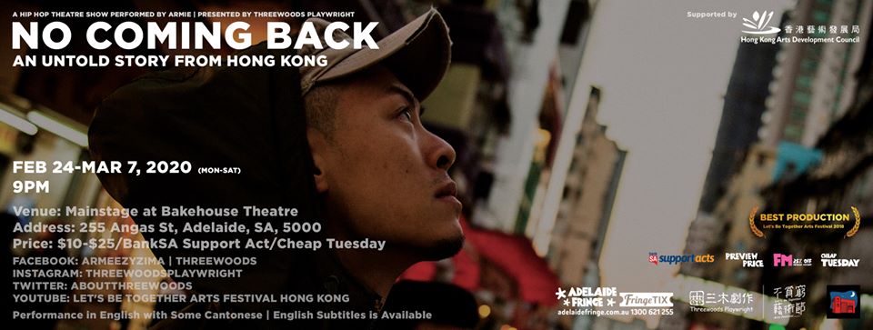 在剛過去的澳洲亞德萊德藝穗節,當中一套劇目是在《不貧窮藝術節 X 香港》2018年獲選為「推薦演出」的《No Coming Back》,在他們出發往澳洲之前,剛好在二月十六日(日)趕及在他們離港前觀看了預演。在回家的路途上,內心不斷回憶起演出的片段。《No Coming Back》由本地一個三人團隊所創作的原創演出,是一套融合戲劇、錄像和音樂,並以hip hop為音樂主軸的多媒體舞台演出。內容講述一名香港男生決定移民到柏林開始新生活,卻在過程中為自己的身份認同和根源而迷惘的故事。當中的苦與樂,正好反映當代青年的思想情懷,與及不同地方的價值觀對他們所帶來的衝擊:香港的鬱悶、柏林的叛逆。感覺主角想透過此劇,尋找思想出路,但更實在的,相信是想藉演出而尋找生活的靈感。