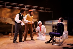 《半》則以畫家的畫作的畫布及支架砌磡嵌出四人的居所,暖色的色調能帶出偽民藝復興的時代感,而為強調四人的身份為洋人,絕妙地以「洋腔」配上對白,亦令喜鬧劇效果更為突出。