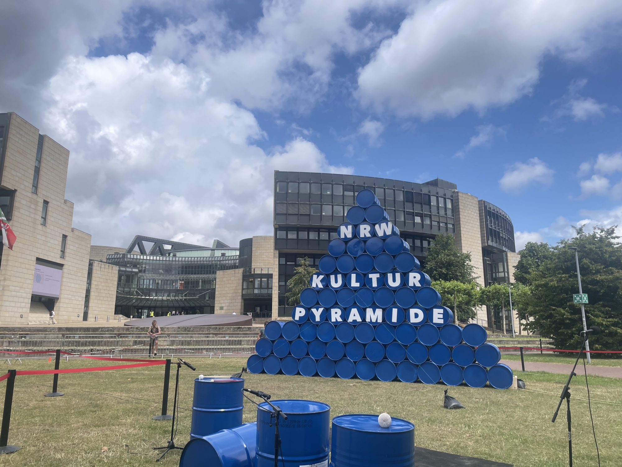 In June, the North Rhine-Westphalia culture pyramid collapsed in front of the state parliament. 80 blue barrels were stacked up to form a pyramid. A symbol and a memorial that if one of the building blocks of the funding system is removed, everything collapses.