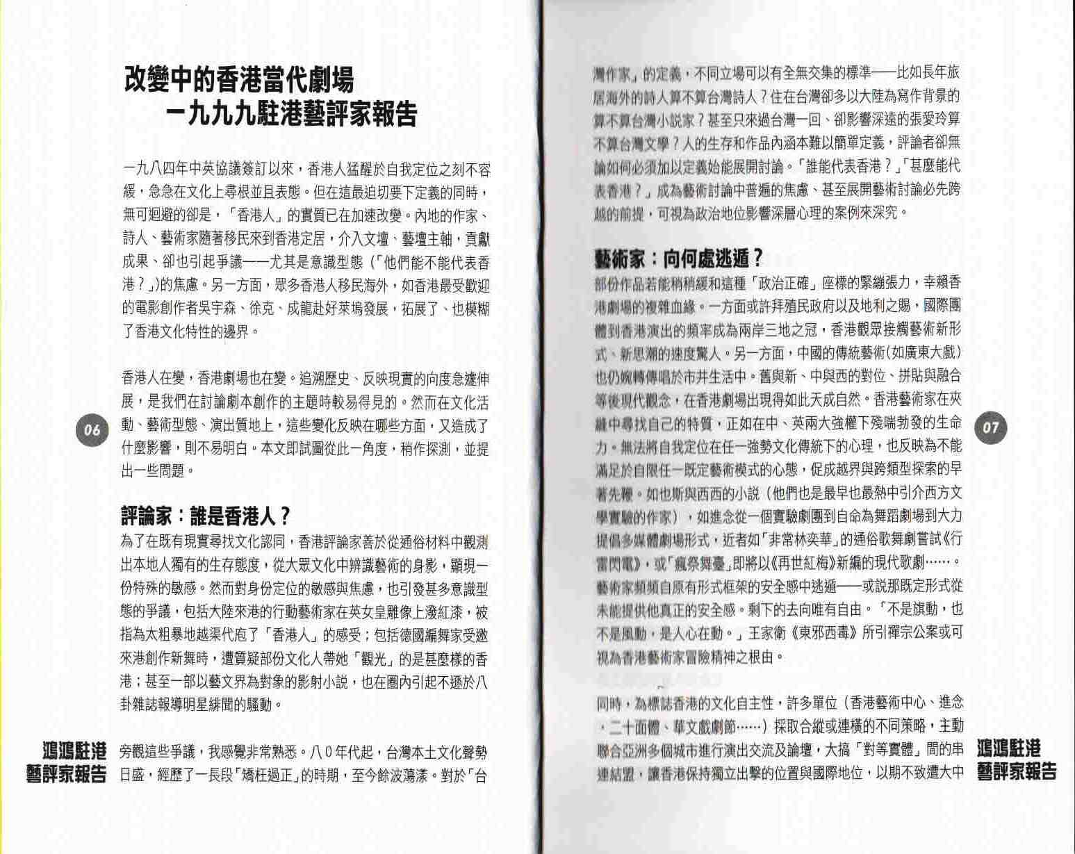 發現中港劇場 林兆華以鳥喻人——批打中西文化各五十板 阮玲玉神話與愛滋大餐——北京戲劇的兩個極端 一九九九香港文化現象與劇場實驗的舊與新 無法快轉的「前戲」——林奕華旋風在台灣 一個快樂而另一個不快樂——記韋純、Kiki和卡爾維諾的結伴旅行 在劇場裡烤蛋糕——廿豆.盒子畫的動作藍圖 競技或對話——中國旅程九九
